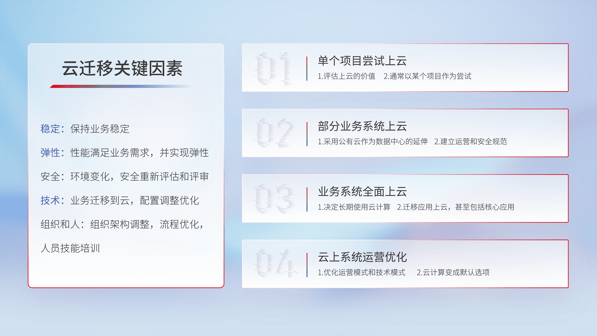 结合实际业务,,,,从规划设计、、、云平台选型、、、、云原生改造、、、数据迁移、、、集成交付,,迁移全过程为客户识别最佳上云路径,,,做好风险识别管理,,,设计网络架构、、身份权限、、、安全审计合规、、、操作审计、、、、日志审计、、、、监控告警策略、、多站点容灾设计等,,,对云上基础设施进行整体规划,,,提升IT治理水平,,,,以满足弹性、、、、高可用、、高性能的需求。。。。