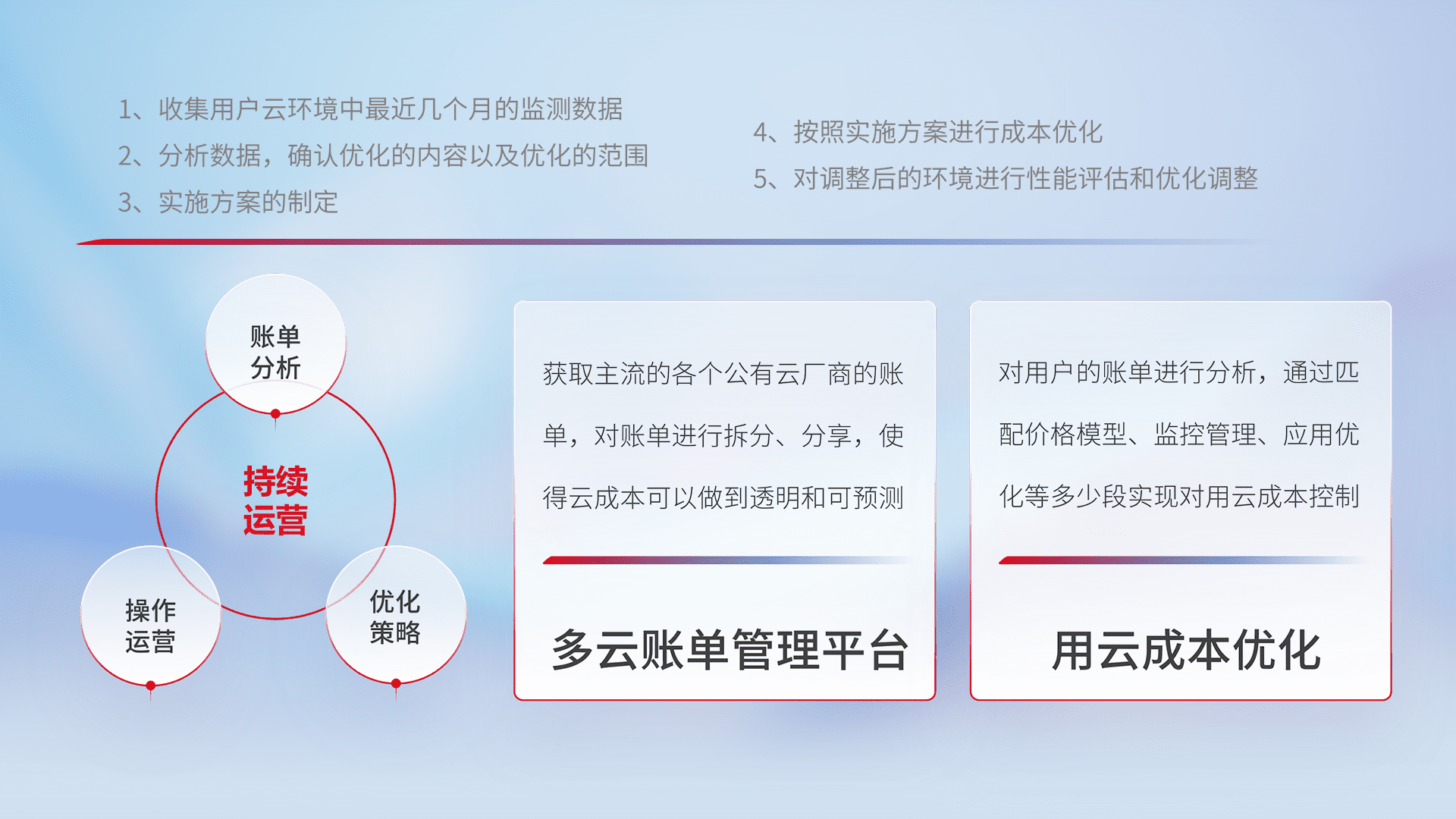 通过多云纳管,,以统一的资源数据模型把客户的云资源进行抽象和封装,,,,进而实现对多云资源的统一操作,,,,保障云资源管理的可靠性、、、稳定性与可用性。。。。量身定制化运维内容,,,,配置、、开发运维、、、、补丁管理、、备份、、、监控、、认证和访问管理、、、审计和日常巡检等,,保障在用云过程中的可靠度,,,,稳定度以及高可用率。。。。